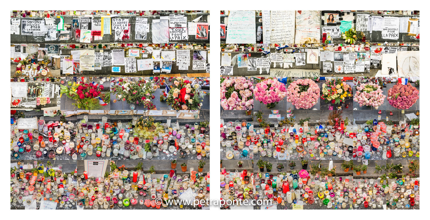 It was a few days after the commemoration of the victims of the 2015 terrorist attacks that I photographed all the testimonials deposited at the statue of Marianne on the Place de la République in Paris. Marianne represents the French republic with an olive branche in her right hand and with her left hand placed on a tablet engraved with the Declaration of the Rights of Man and of the Citizens of France. I made a collage book with 400 photos of the tributes, flowers, and momentos surrounding the base. It is a book "in memory of the victims of the horror of the irrational, far, near, here, elsewhere, before, now, tomorrow, you, me, he, she, they, men , women, children, ... "